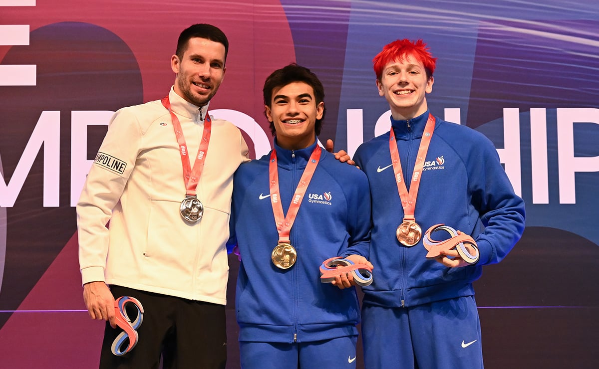 Ruben Padilla became a three-time world champion Saturday, taking gold in men’s double mini trampoline for the third straight time as teammate West Fowler claimed bronze at the 2025 Trampoline World Championships in Spain.